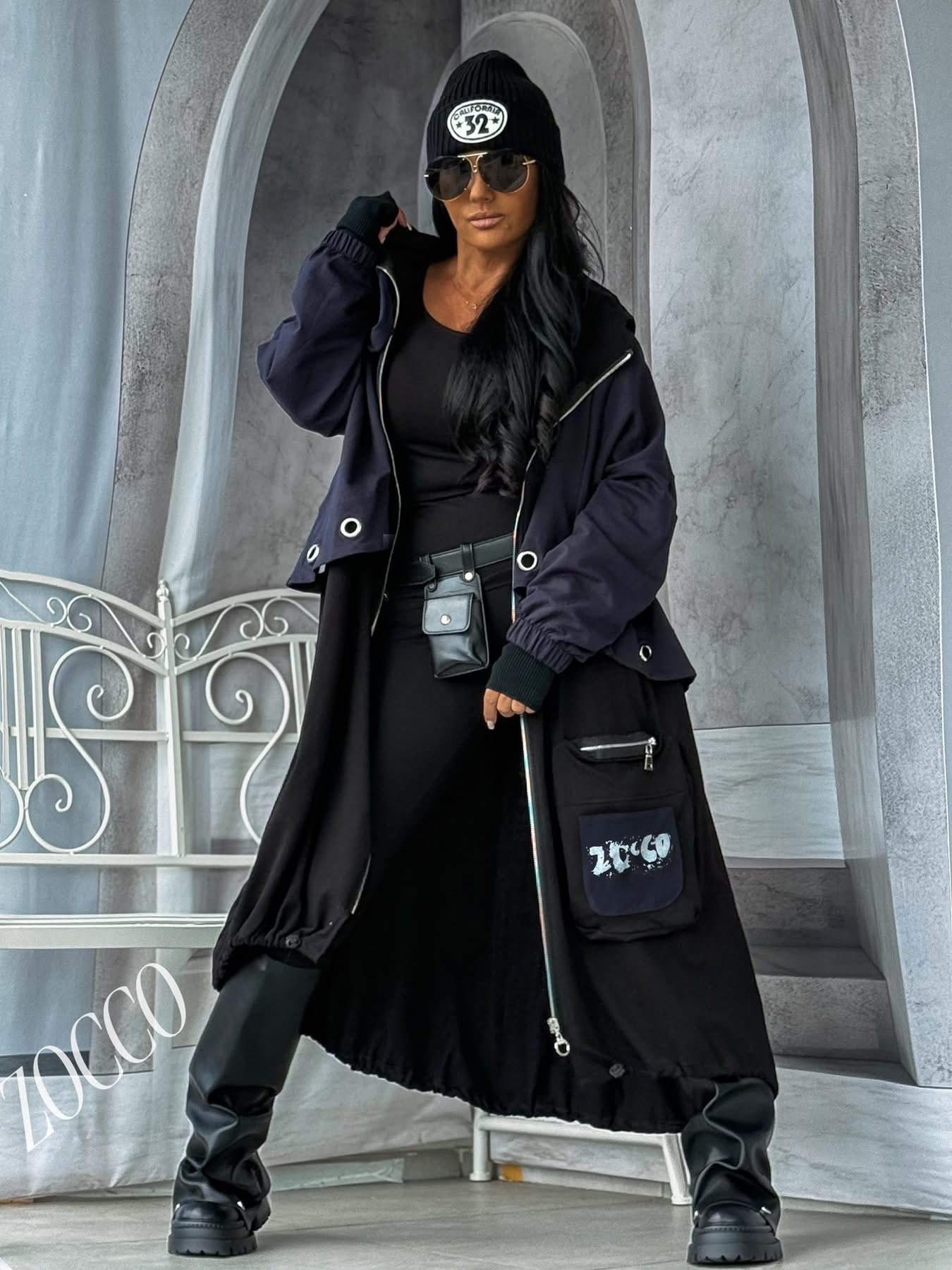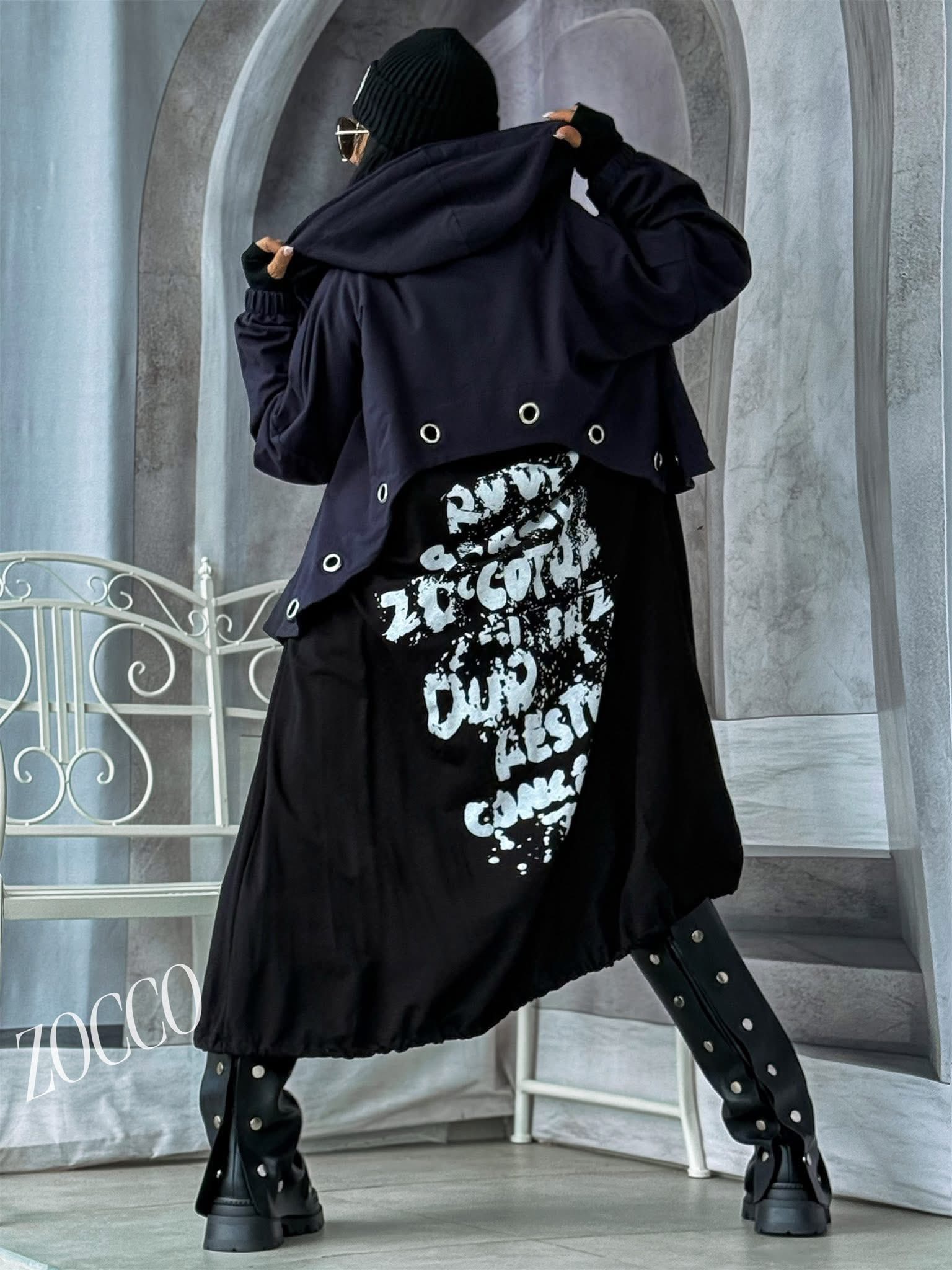 Długa bluza damska Zocco to propozycja, która wyróżnia się niepowtarzalnym designem. Model zapinany na długi metalowy zamekl. Bluza i spódnica zostały połączone w jedną spójną całość, tworząc unikatowy fason, który doskonale wpisuje się w aktualne trendy. Tył bluzy zdobią metalowe kółka oraz efektowna aplikacja tekstowa, które nadają jej charakteru w stylu streetwear.