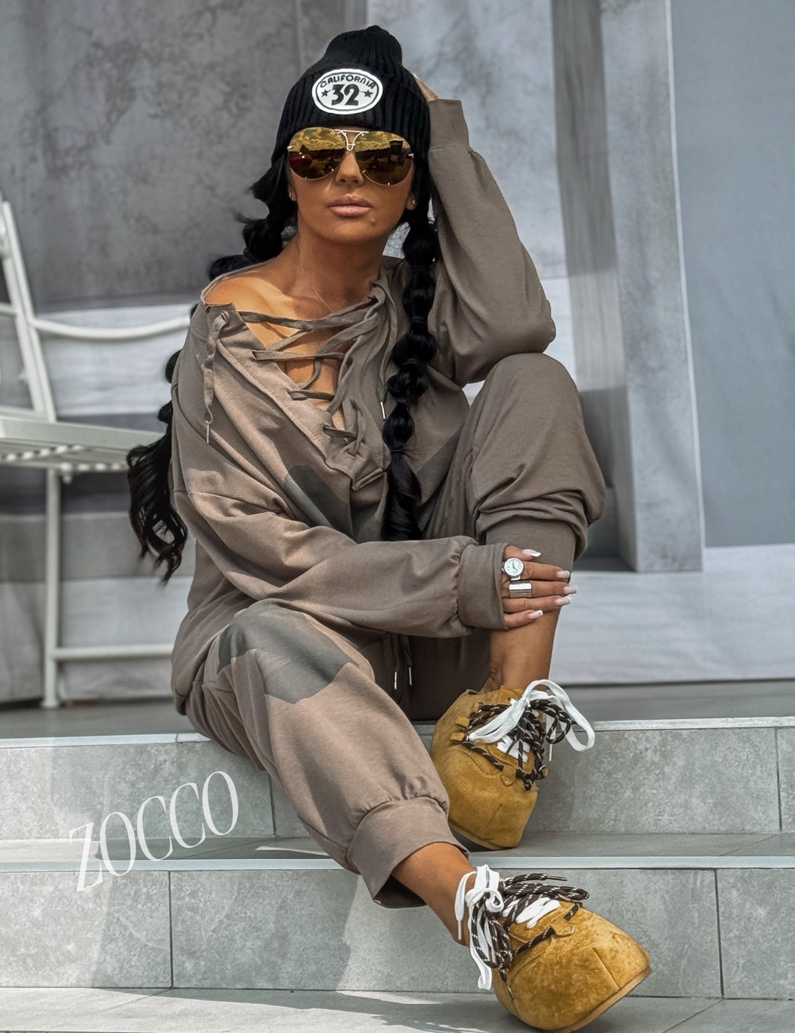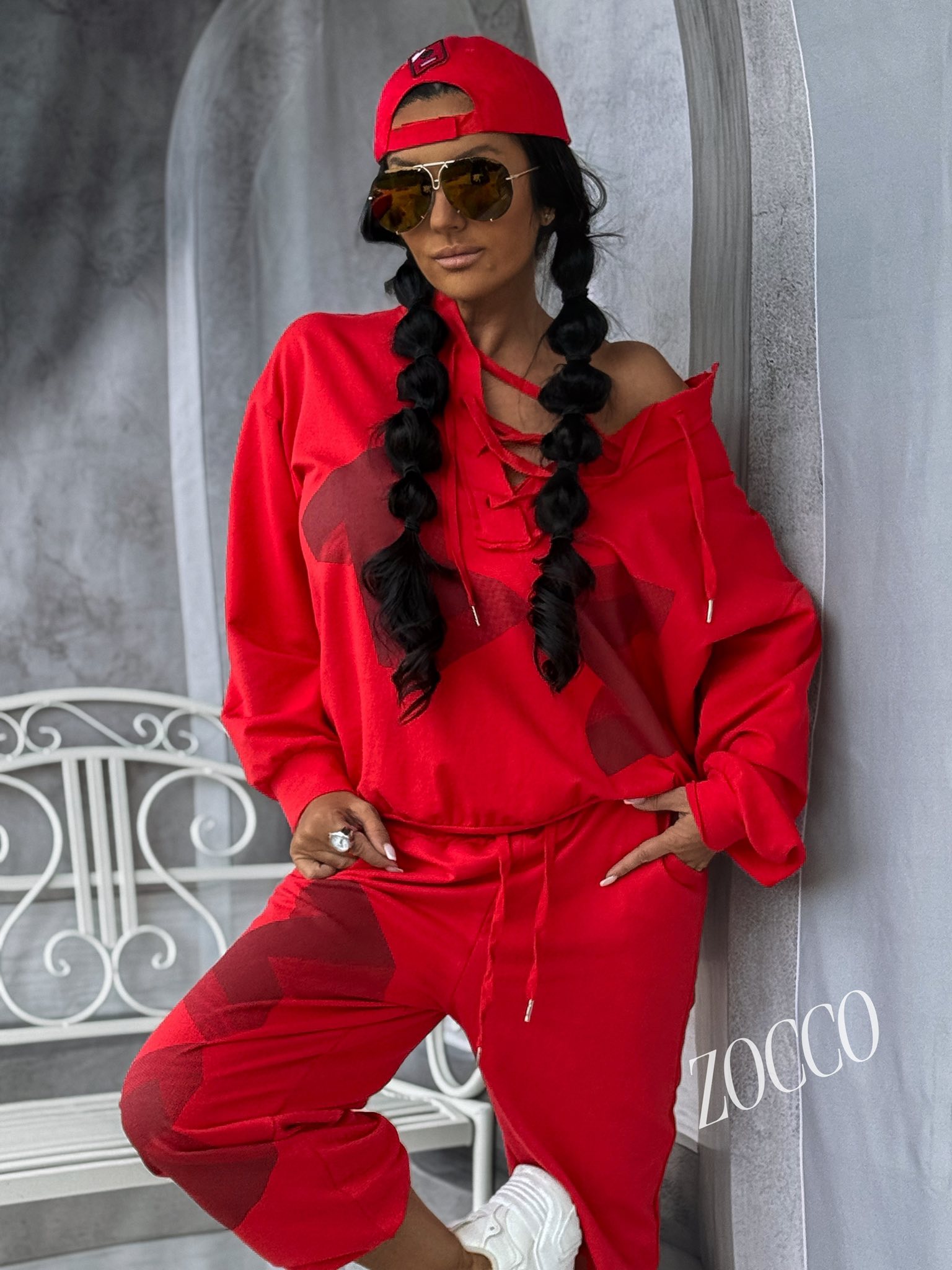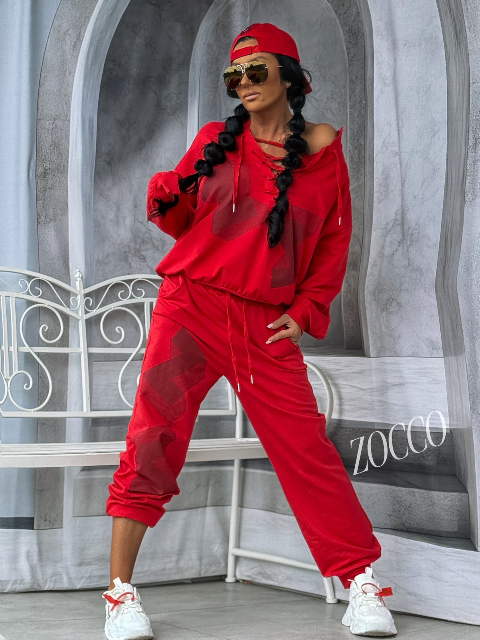 Komplet od Zocco składający się z bluzy i spodni. Ten modny komplet wyróżnia się ozdobnym, naklejanym printem oraz sznurowanym dekoltem. Idealny na co dzień, na spacer, do miasta czy na aktywny wypoczynek. Wyróżnij się stylowym i wygodnym zestawem dresowym marki Zocco!